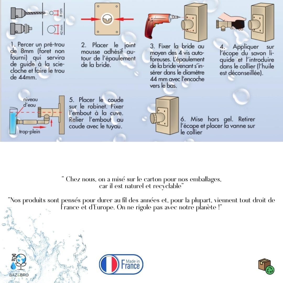 - CONTENU : 1 bride + 1 écope avec son robinet + 1 coude de sortie 90° + 1 scie cloche bimétal + 4 vis autoforeuses + 1 joint mousse + 1 tuyau de 60 cm + 1 mèche 26mm pour raccord cuve.
